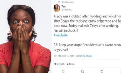 “A lady was indebted after wedding and killed herself after 3 days, the husband drank sniper too and he’s dead now. Today makes it 7 days after wedding. I’m still in shock!!! Come and see shouts here o. For the first time this year, I had tears in my eyes I’ve never believed it until what I saw this night. It was really a terrible scene, wife still dey mortuary sef” she tweeted.